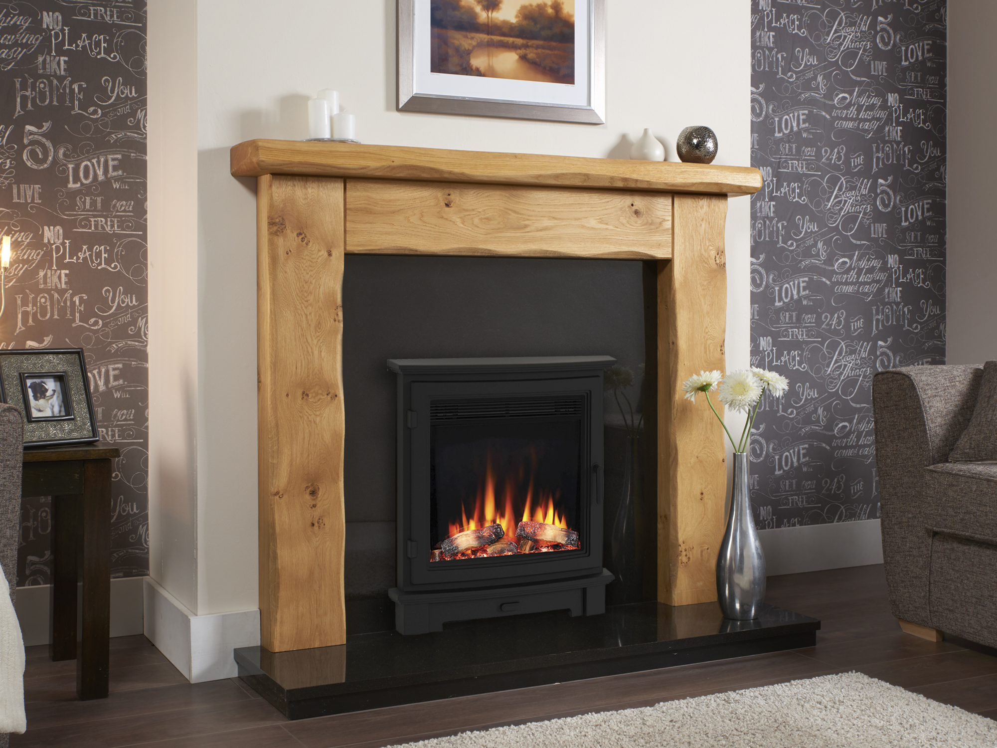 The Florence Solid Oak Electric Fire Suite is designed to fit a flat wall seamlessly, featuring the contemporary Stamford Fire Surround and completed with the new Celsi DLX 600XT Electric Fire for realistic flames.